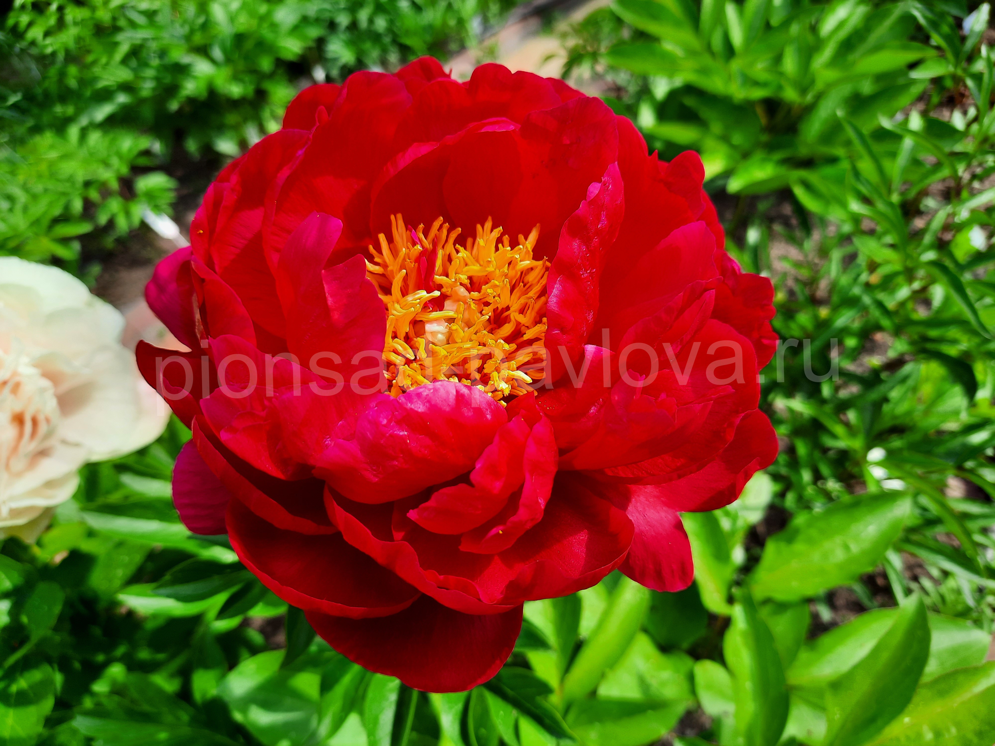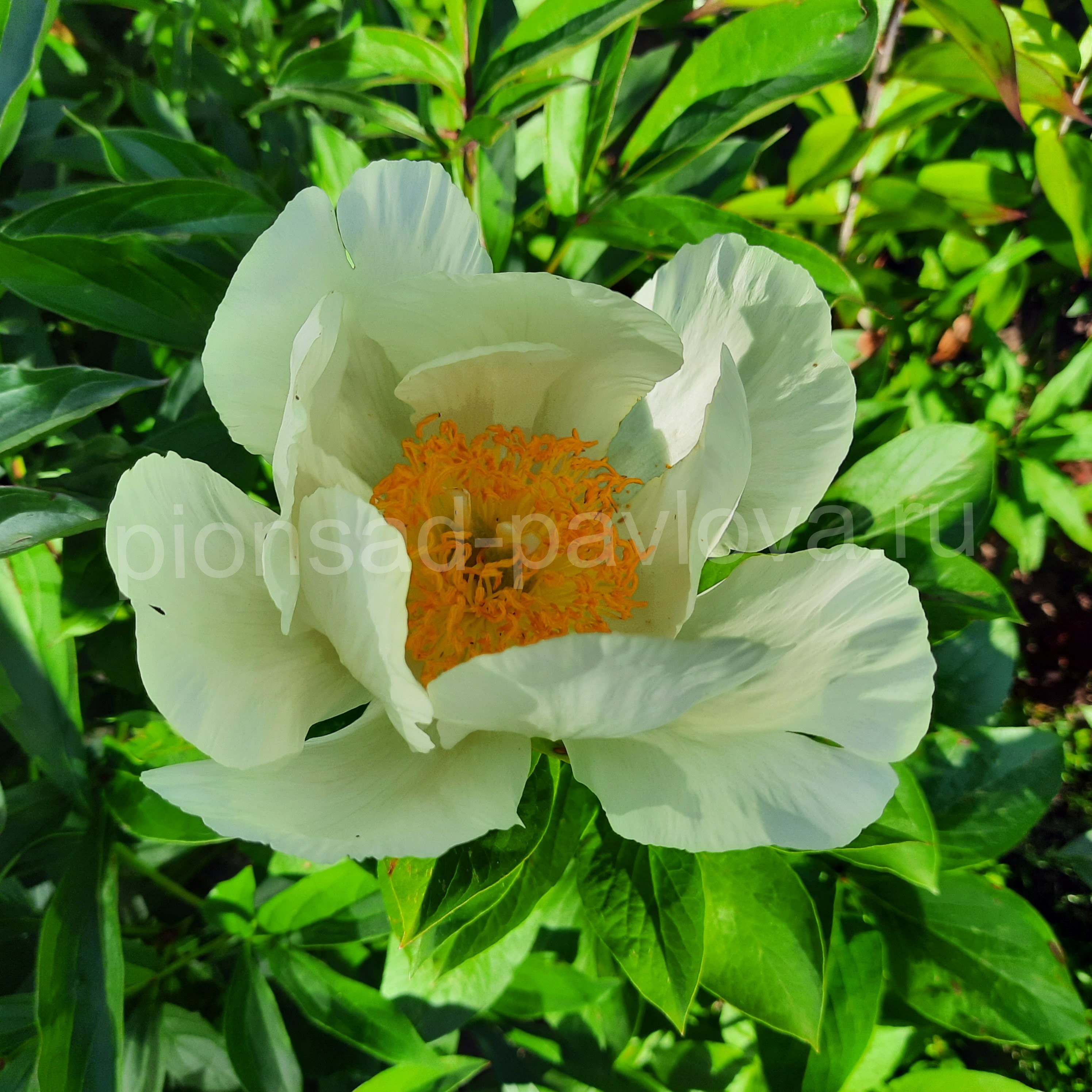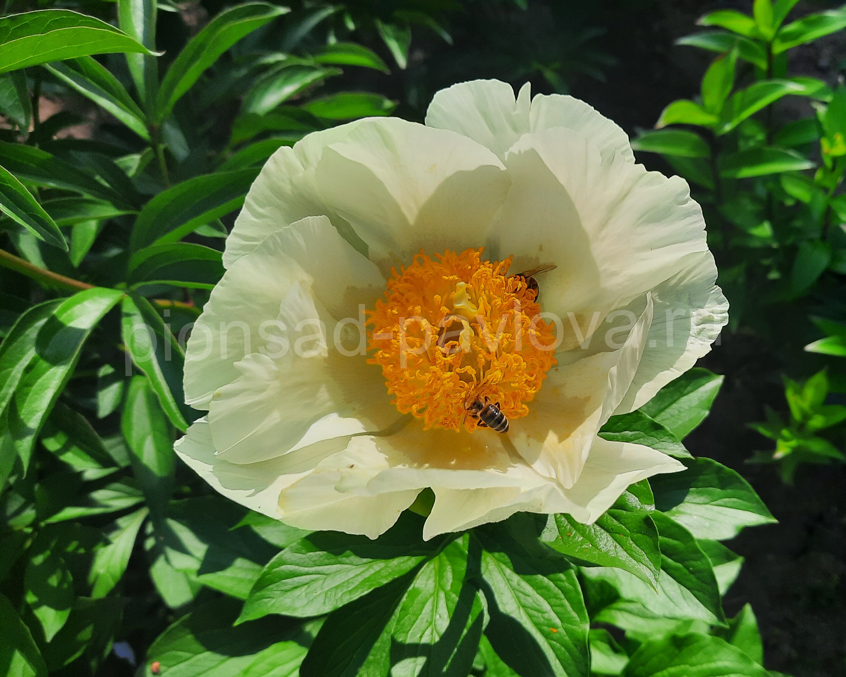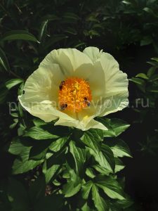 КУЗИН НОРА – Сousin Nora (питомник paeonienemrich.de, Германия)Гибрид. Простая форма цветка. Белый с кремовым оттенком, лепестки широкие. Округлые. Гофрированные. В центре пучок золотистых тычинок, очень много пыльцы. Куст компактный, стебли прочные. Диаметр цветка 17см, высота куста 75см. Средне-раннего срока цветения.