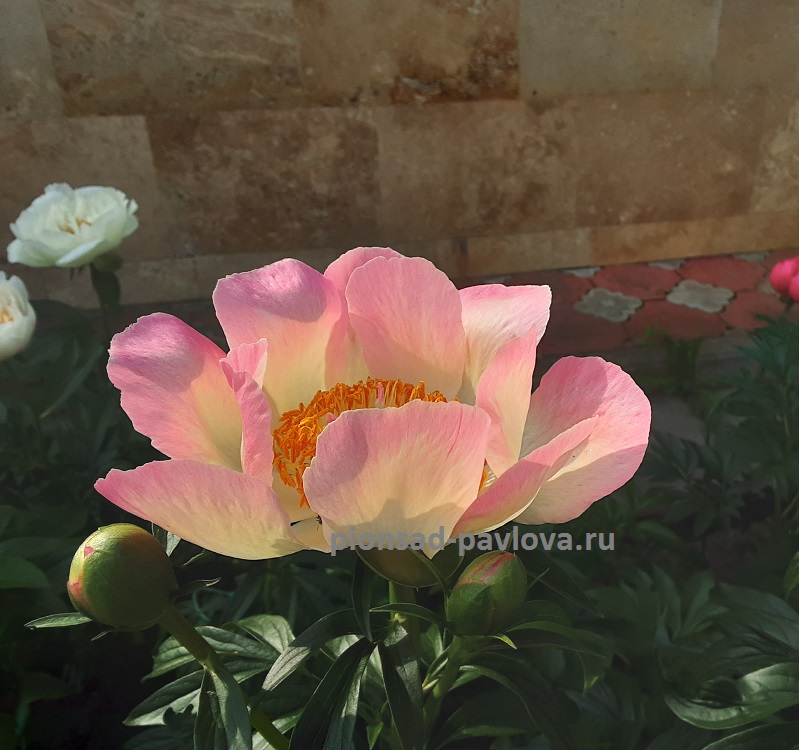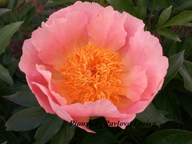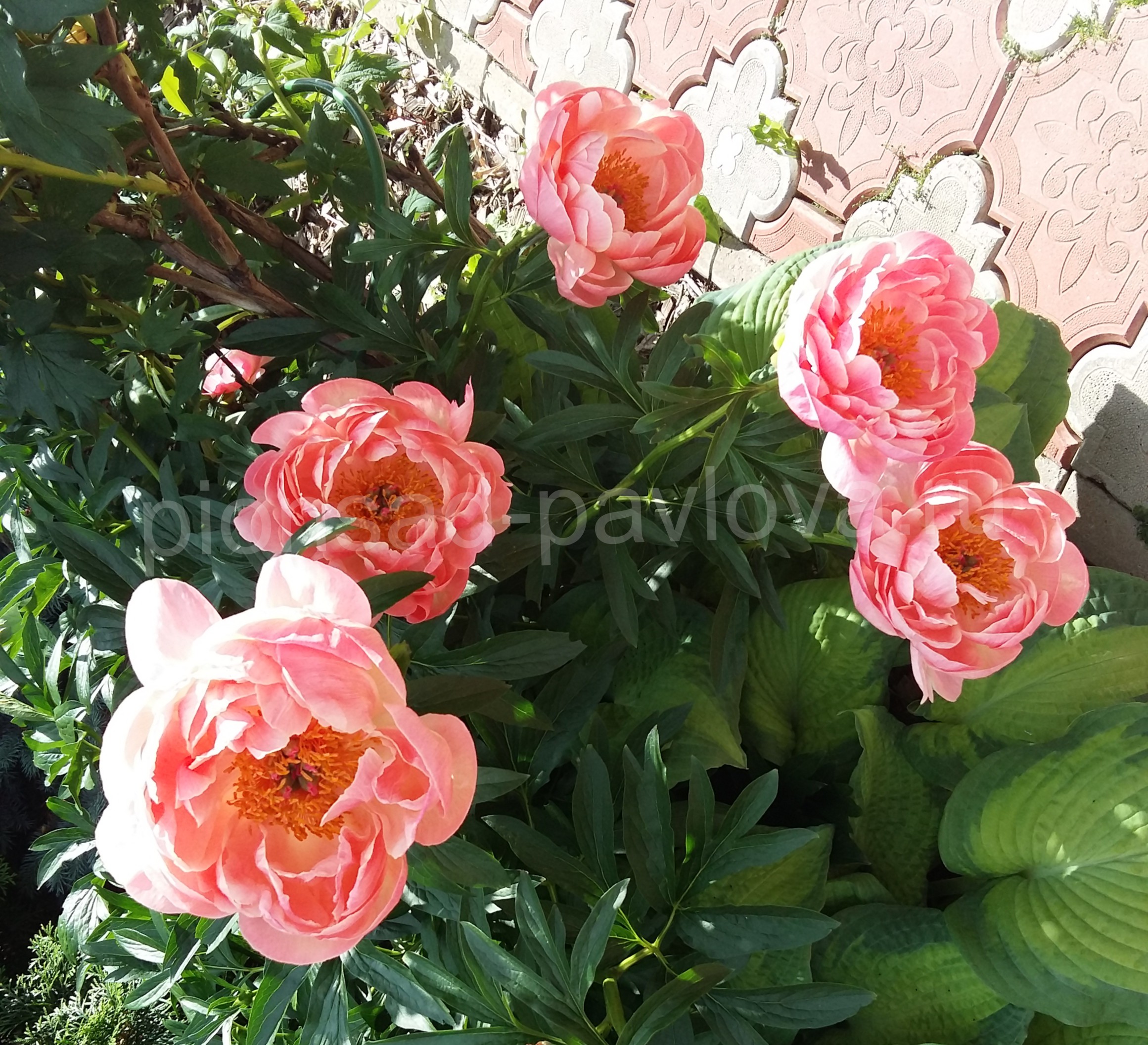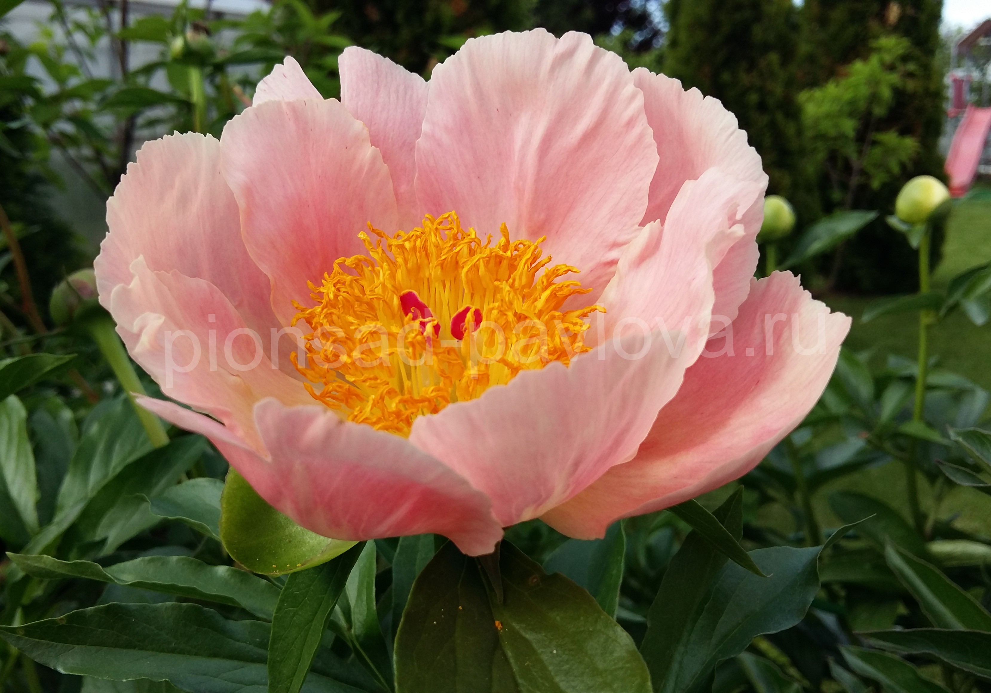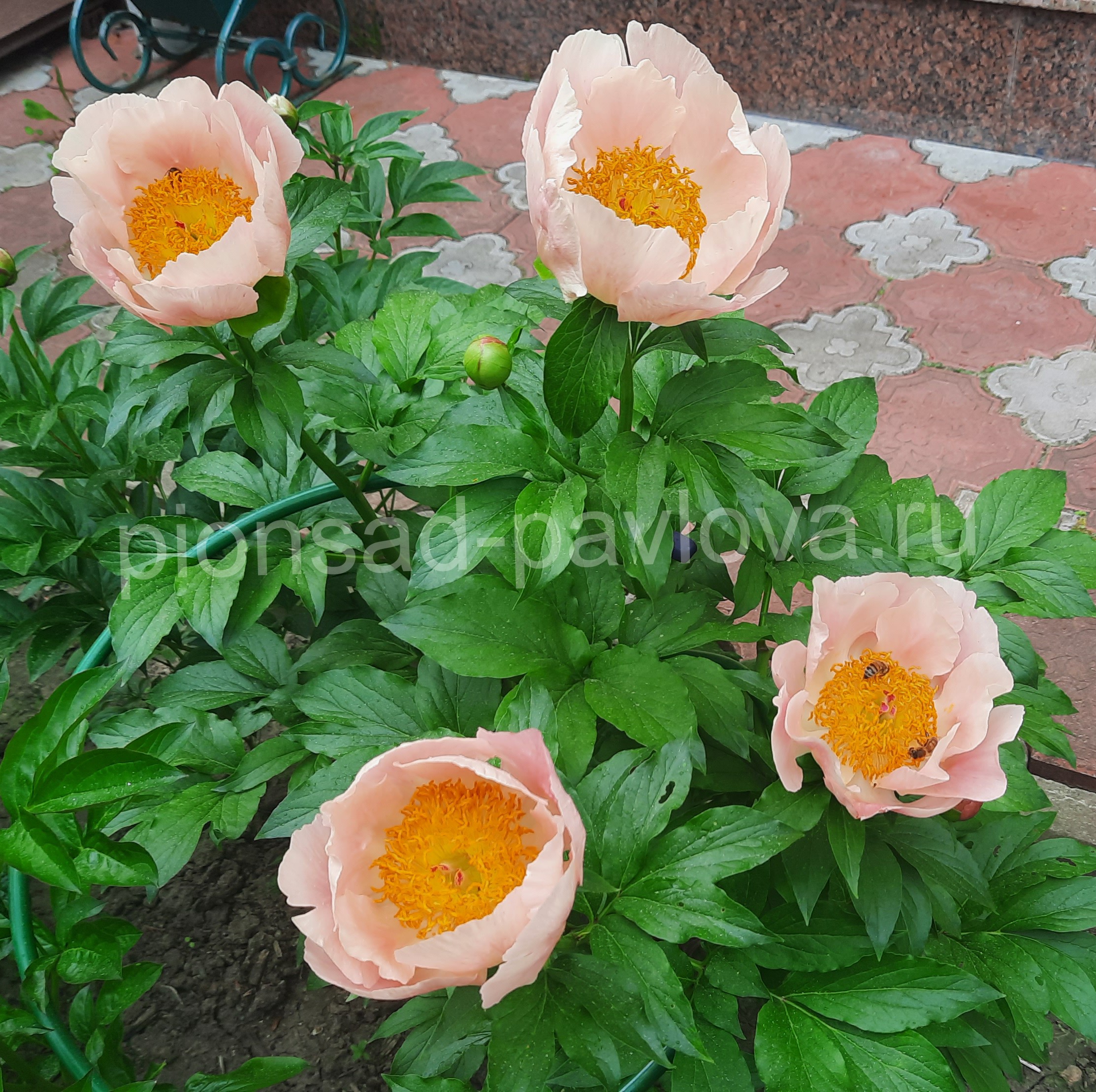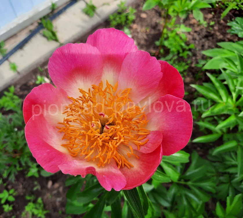 ЛАНИНГ ПИЧ СИНГЛ- Laning Peach Single (Ланинг, 1990, США) Гибрид. Простая форма цветка, Красивая чашевидная форма. 2 ряда кораллово-розовых гофрированных лепестков с кремовым оттенком у основания. В центре пучок золотистых тычинок. Высота куста= 80см. Диаметр цветка=18см. Куст прямостоячий, с очень толстыми стеблями. Ранний срок цветения:.